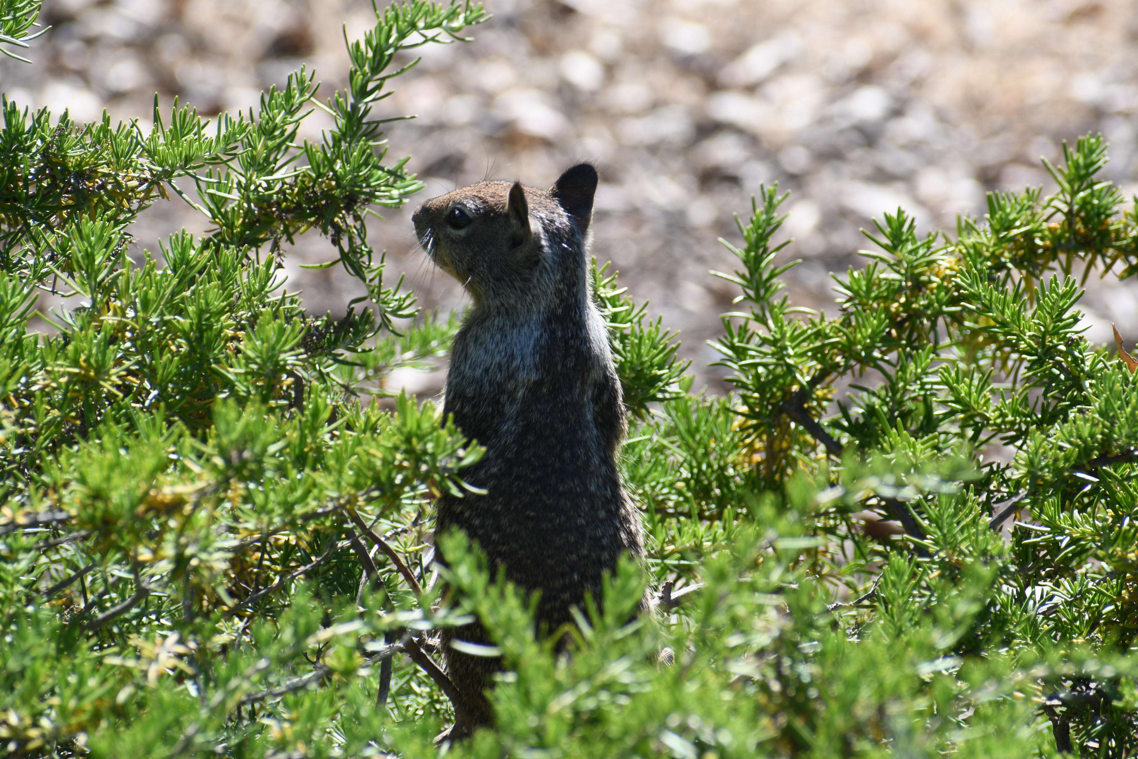 This ground squirrel cautiously watches me from a bush in Stanford, California.
