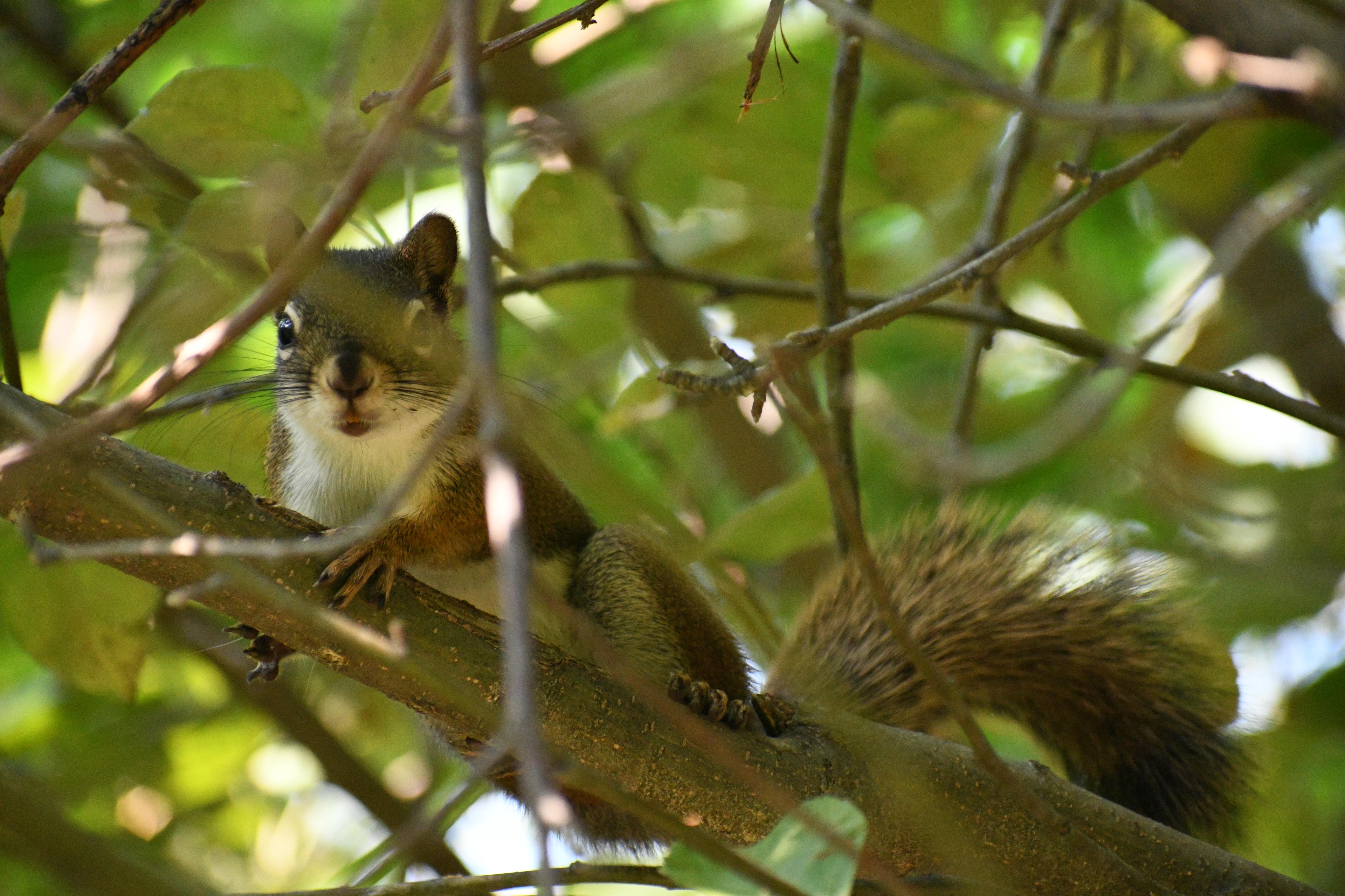 This pine squirrel, seen here hiding hiding in a backyard tree, lives in a residental neighborhood in Salt Lake City, Utah.